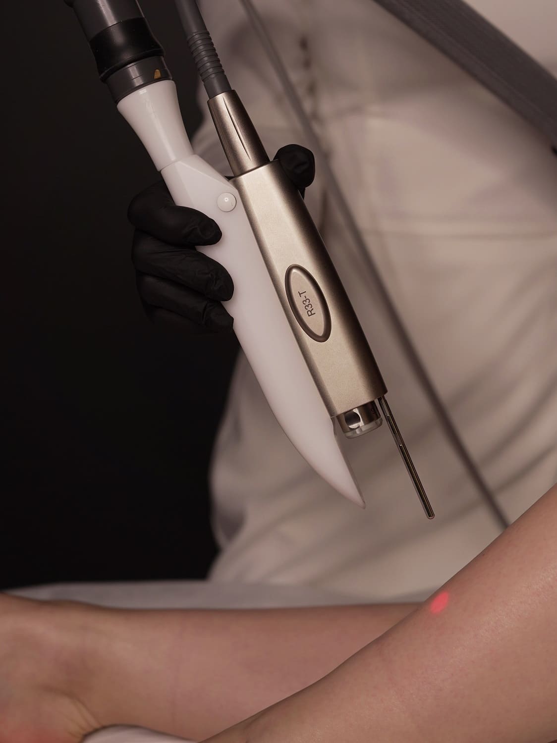 Специалист последовательно обрабатывает выбранную зону лазерным излучением, перемещая манипулу по поверхности кожи и воздействуя на волосяные фолликулы.